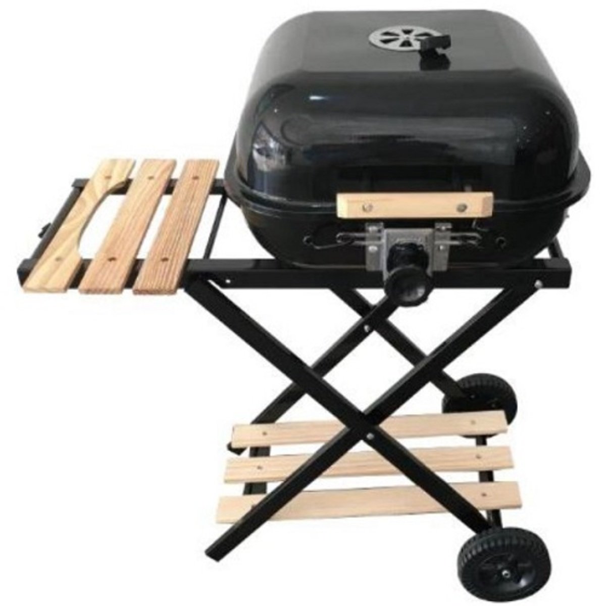 تتميز الشواية بهيكل متين وعربة مربعة قابلة للطي تسهّل عليك التنقل والتخزين، مع طاولة جانبية من شرائح خشبية عشان تجهز المكونات أو تضع الأدوات وانت تطبخ براحتك.