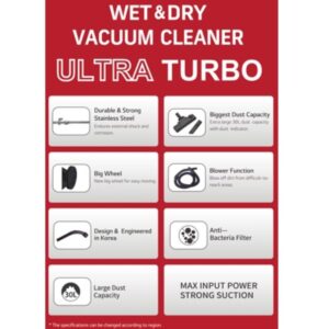 تعمل على التنظيف الجاف والرطب، وتتميز بهيكل من الفولاذ المقاوم للصدأ يعطيها شكل أنيق ومتانة عالية.